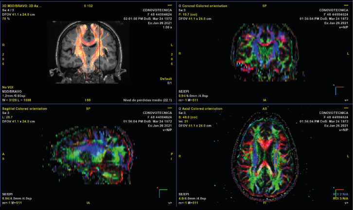 Mediante unos mapas de colores la difusión permite realizar una tractografía permitiendo valorar especialmente los tractos de sustancia blanca a nivel cerebral y realizar un mapa de la red de fibras nerviosas. Entre sus aplicaciones fundamentalmente permite valorar isquemia cerebral, enfermedades desmielinizantes, epilepsia, patología tumoral y se está empezando a estudiar en demencias y trastornos neurodegenerativos.