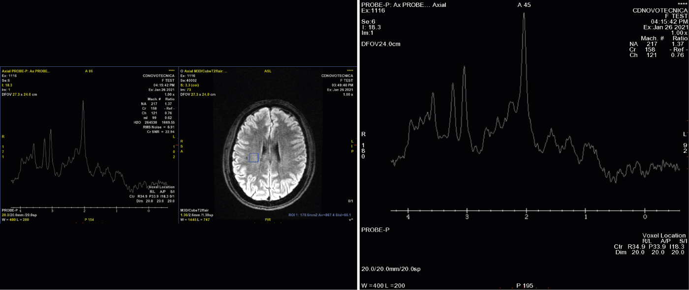Analizamos los metabolitos, que son distintas sustancias simples producidas en reacciones metabólicas en el organismo. Por ejemplo, lo que denominamos marcador neuronal es el N-acetil aspartato, que es abundante en sustancia gris; la colina, es un marcador de las membranas celulares. Se estudian los metabolitos “per se” y también la relación entre ellos.